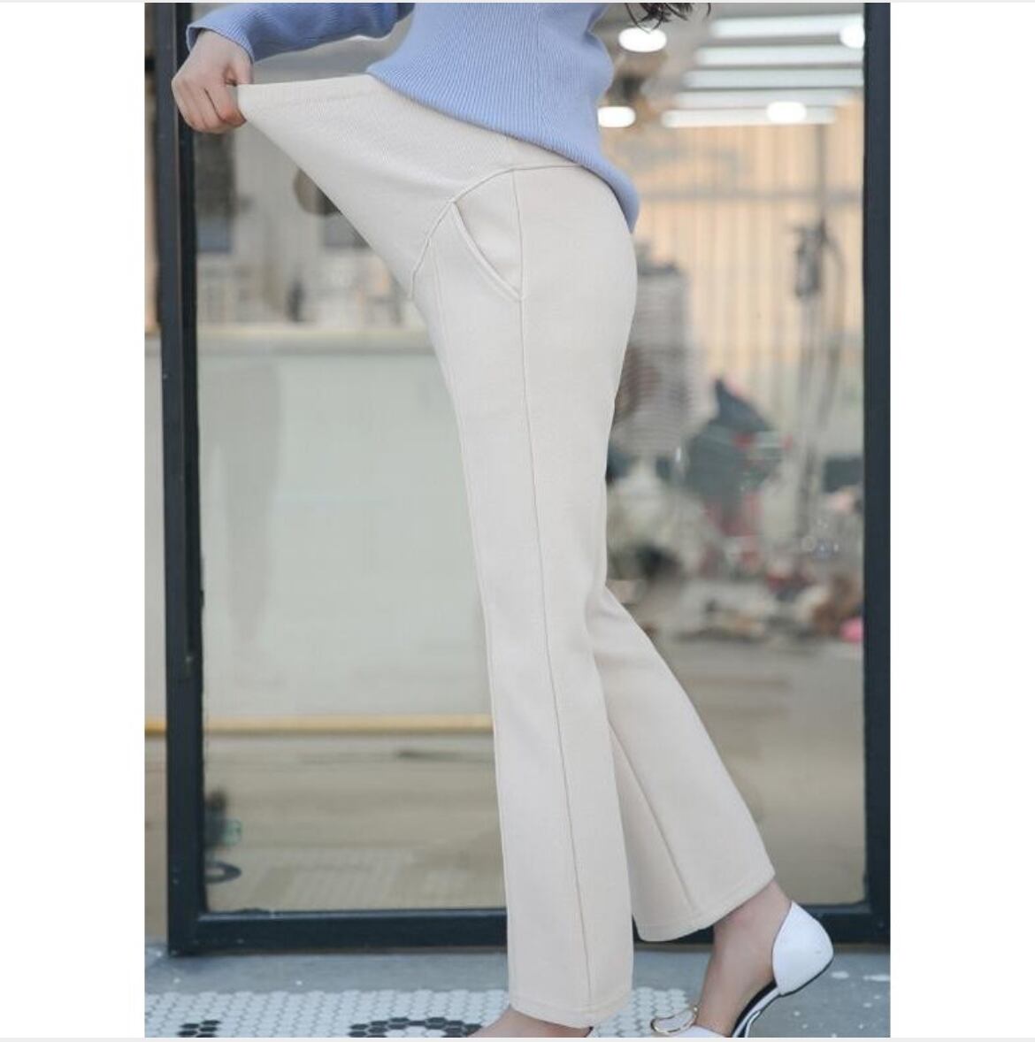 マタニティ期間中におすすめの快適ボトムス、マタニティパンツ。妊娠中のおなかへの負担を最小限に抑えるため、ストレッチ性に優れた起毛生地を使用しました。柔らかな肌触りと抜群のフィット感で、おなかまわりの成長に合わせて快適に履き続けられます。