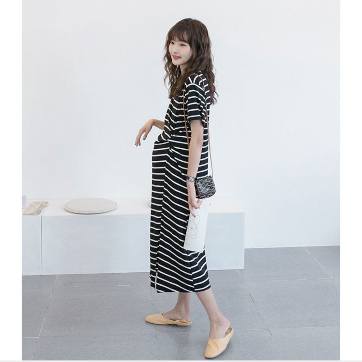 ボーダー柄がポイントで、おしゃれな印象を与えます。ロング丈で体型をカバーし、マタニティ期間中のお腹の変化や体型の変化をうまくカバーリングします。さらに、スタイルアップ効果もあり、妊娠中のママにも自信を与えること間違いありません。