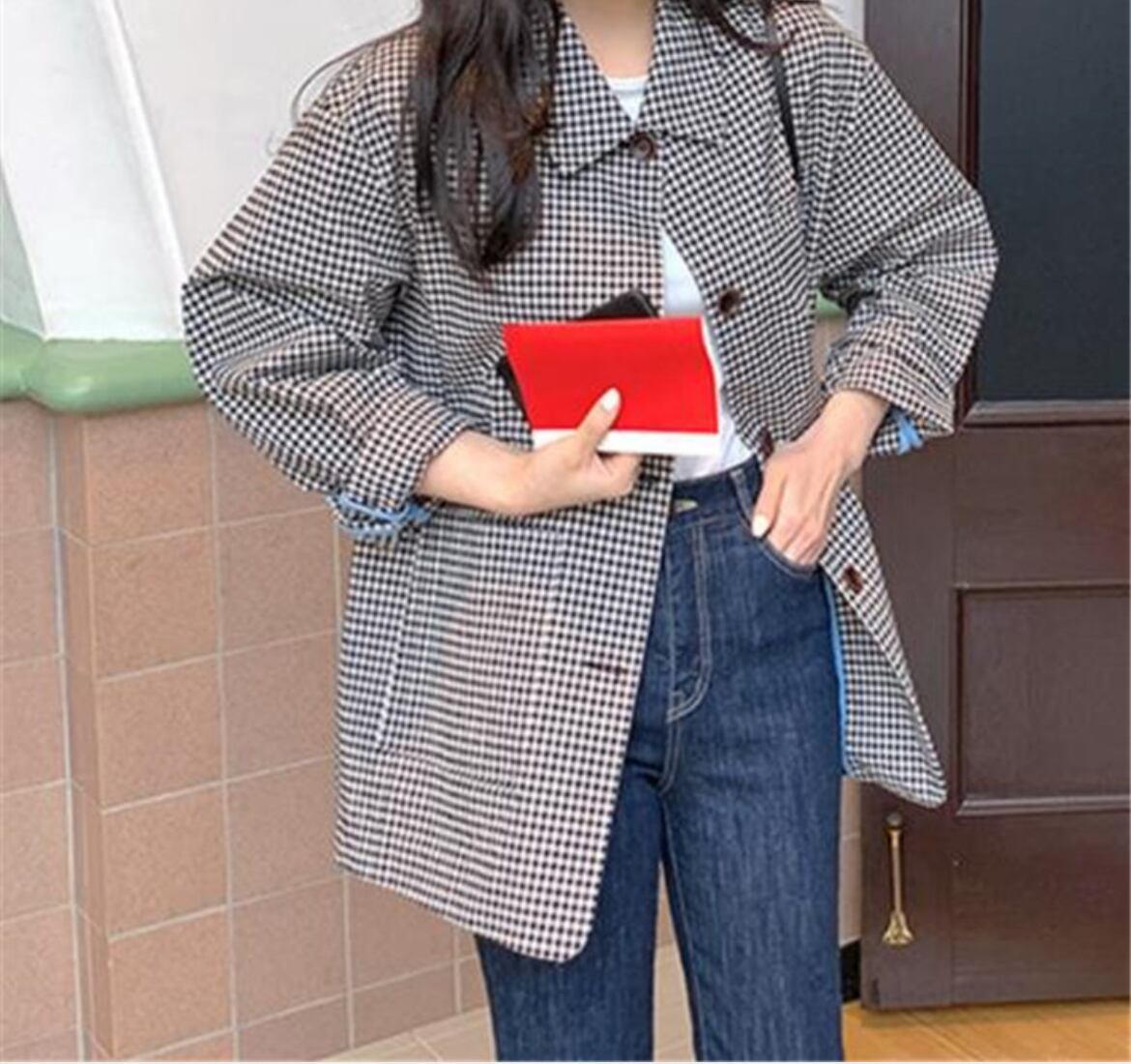 使いやすい 韓国 秋 新作 レトロ 格子縞 ラペル ゆったりする コート カーディガン